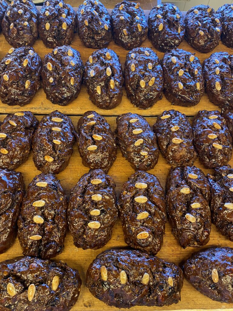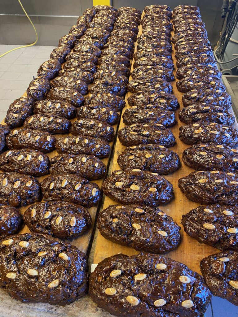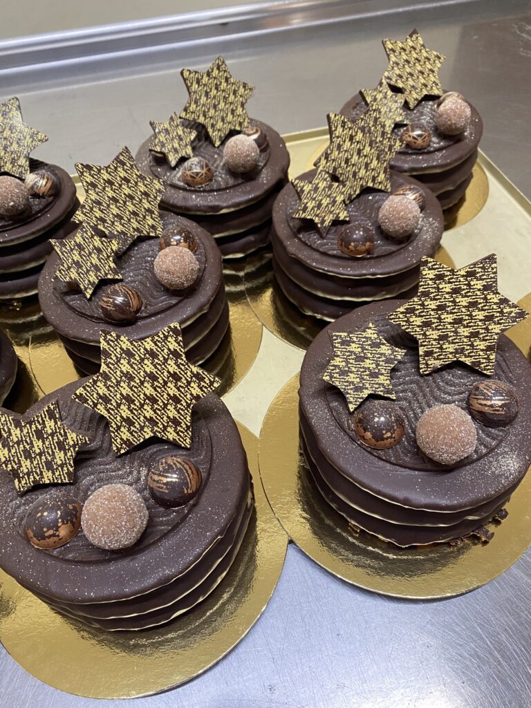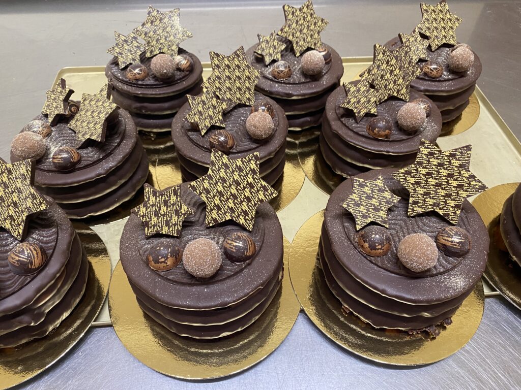 Baumkuchenringe umhüllt mit edler Zartbitter Kuvertüre in weihnachtlichem Gold-Dekor.